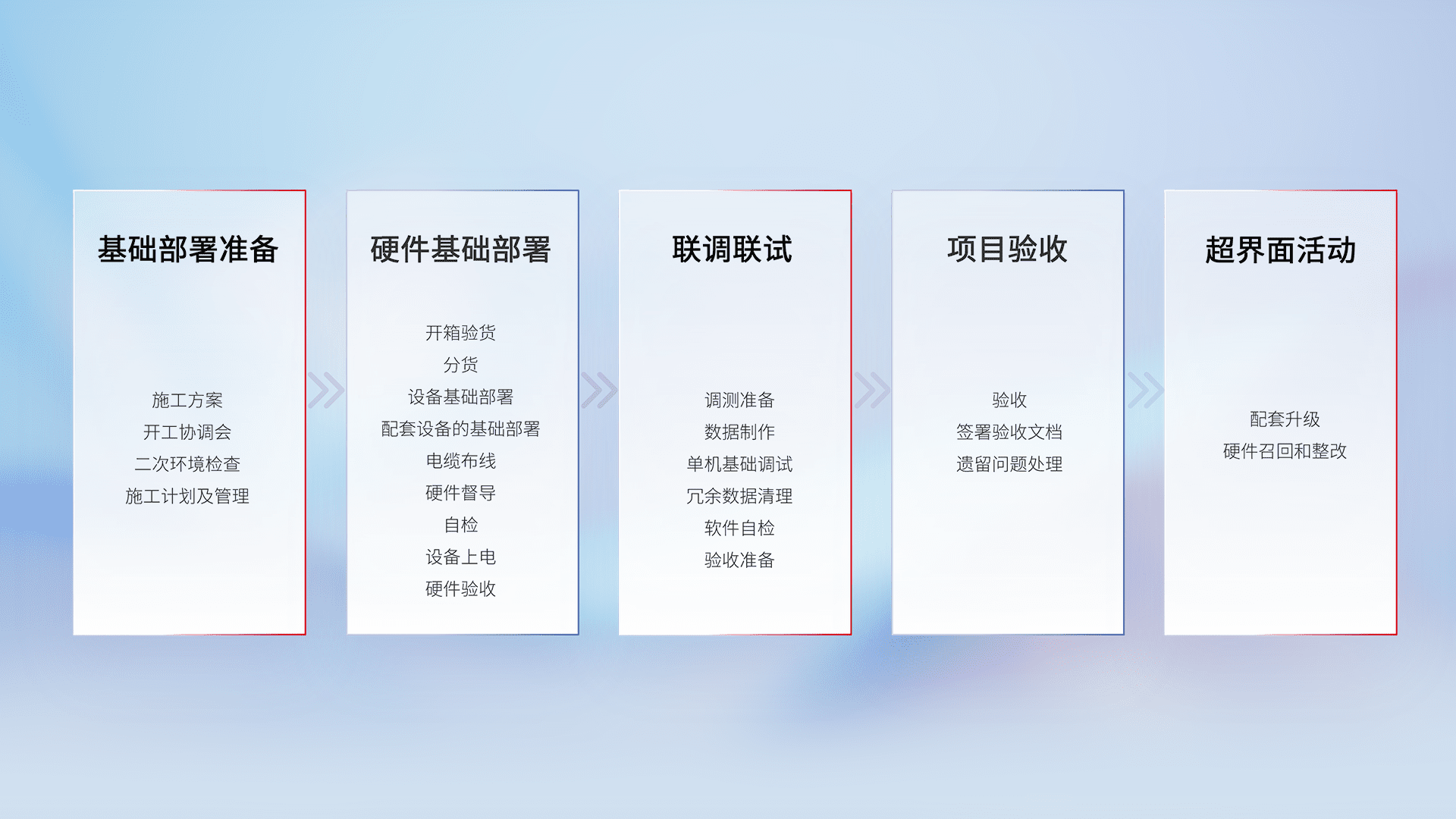 从基础部署准备、、、、硬件基础部署、、联调联试、、项目验收、、、越界面活动的全过程可追溯,,,,保证施工质量和进度。。。